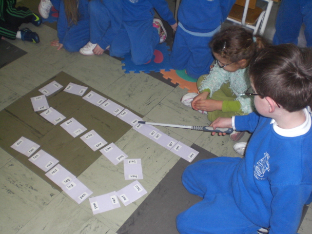 Our class is involved in the Keep on Track train project at https://keepontrack.scoilnet.ie/. We are learning songs and rhymes about trains, playing train games in PE, and even reading like trains. Fist of all we play a phonic or word list loop game. (One player calls out “I have pet, who has ten?” and the person with the word “ten” keeps the game moving in the same way.) Once the game has been played and the cards are laid out in order, in the shape of a train track, we read then at a train pace – starting very slowly and then getting quicker and quicker and slowing down at the end. We like the rhythm of this game.